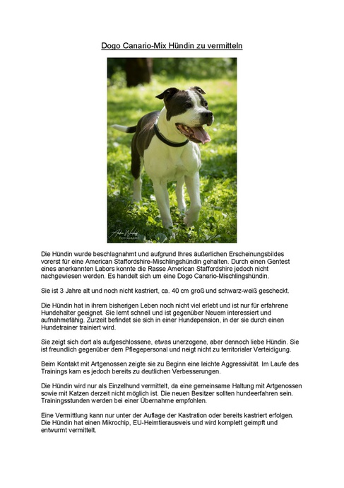 Für sie suchen wir aktive Menschen, die mit ihr eine Hundeschule besuchen, die bereits Hundeerfahrung haben, ein Haus mit eingezäuntem Garten wäre klasse.
